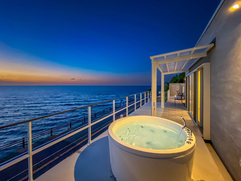 瀬戸内海を一望できるテラスがisola terrace awajiの一番の魅力です。180度のパノラマビューは日常の疲れを癒してくれる絶景です。天気の良い日には、水平線に浮かぶ小豆島がはっきりと展望できます。夜にはBBQと屋外ジャグジーバスをお楽しみください。一度テラスのベンチに座ると室内に戻れなくなるくらい素敵な場所です。