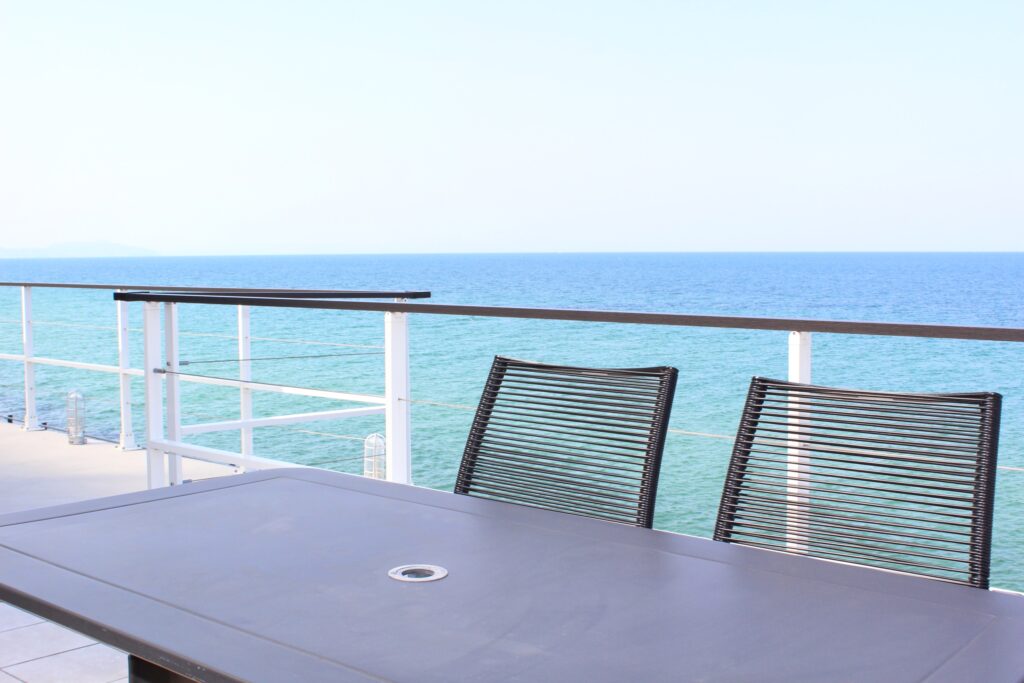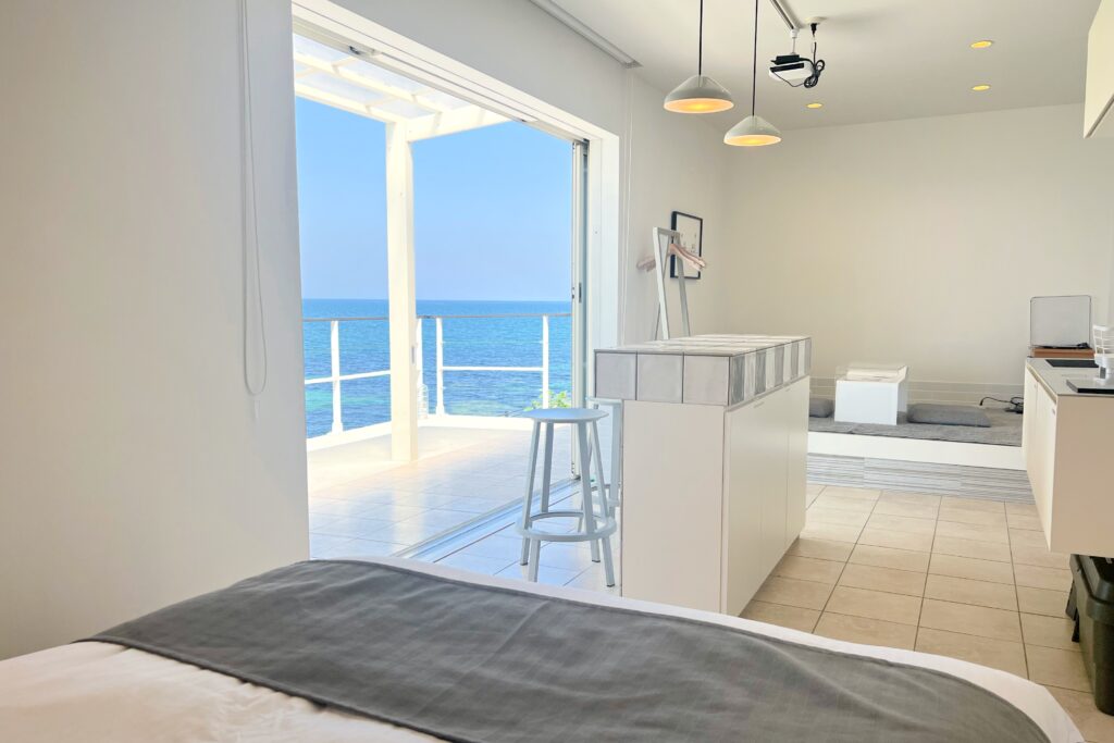瀬戸内海を一望できるテラスがisola terrace awajiの一番の魅力です。180度のパノラマビューは日常の疲れを癒してくれる絶景です。天気の良い日には、水平線に浮かぶ小豆島がはっきりと展望できます。夜にはBBQと屋外ジャグジーバスをお楽しみください。一度テラスのベンチに座ると室内に戻れなくなるくらい素敵な場所です