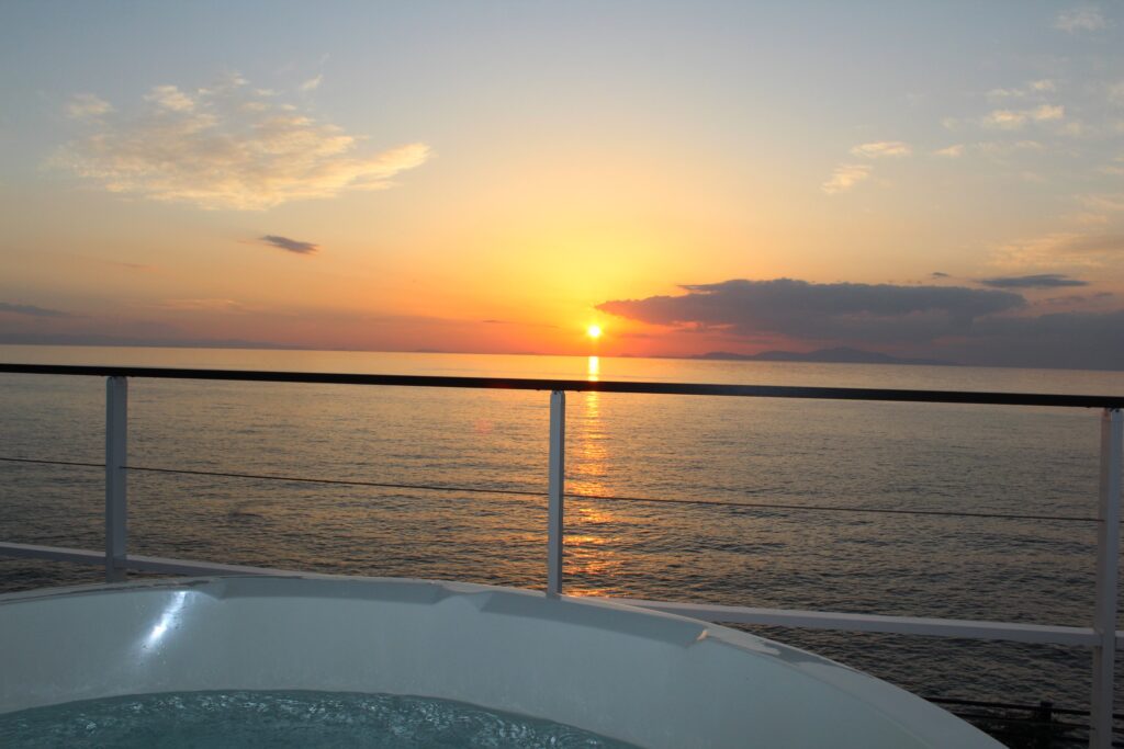 季節やその日の天候によって様々な表情を見せてくれるサンセットを180度望めます。雲が多い日は、雲に反射して空一面がオレンジ色に染まり幻想的な景色が目の前に広がります。静かに沈みゆくサンセットは、沈んでからも紫色に雲を染め上げます。沈みきる最後の一瞬まで雄大で優雅な自然の景色を映し出してくれます。
